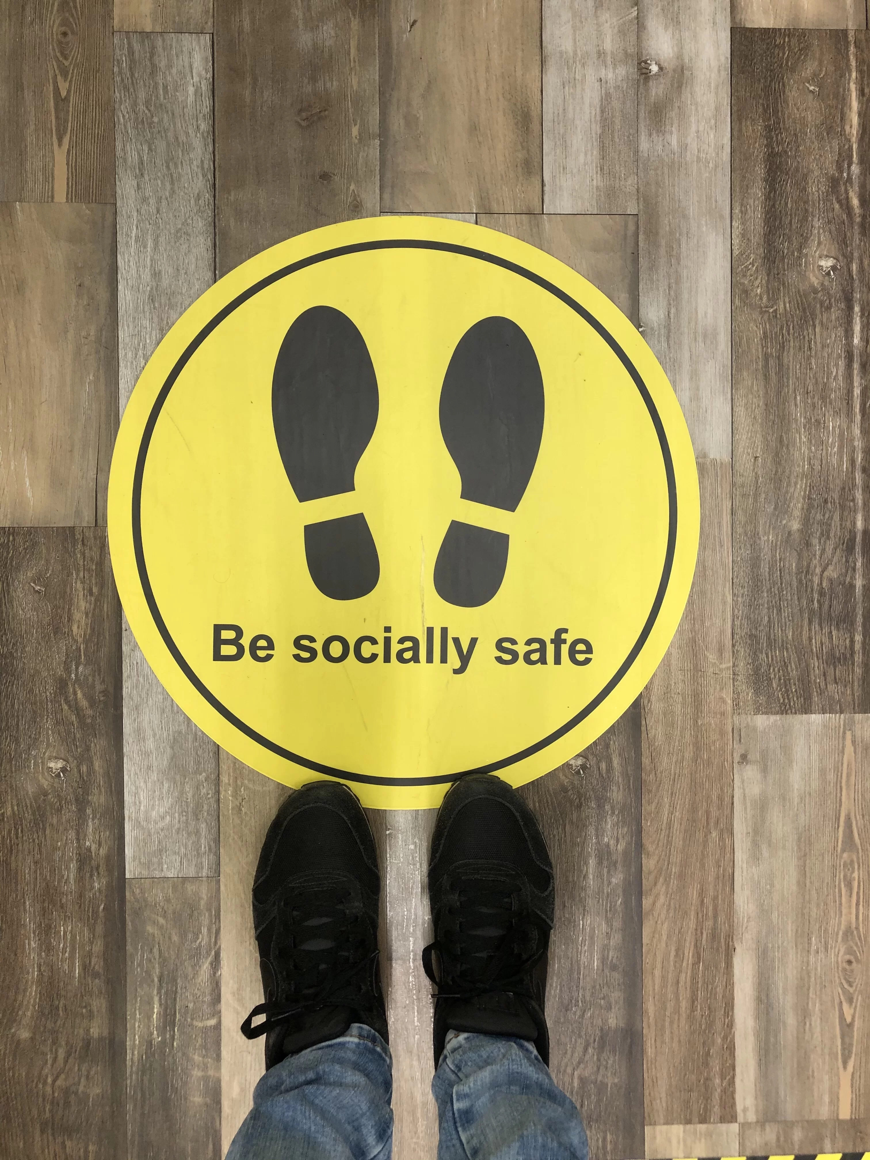 “Sosyal mesafeyi koruyun”, “Sıranız için burada bekleyin” gibi zemin etiketleri düzen sağlar.